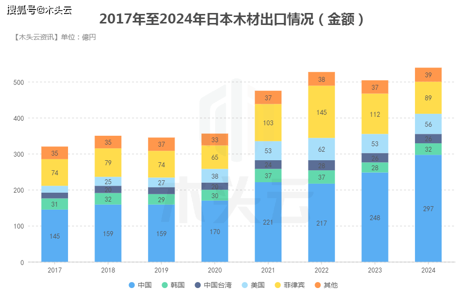 虽然坐拥如斯丰硕的丛林资本,但日本的木材财产却呈现出进出口并存的奇特态势。此中,出口的次要木材类型为二和后大规模种植的人工林,这类林木正在日本国内占领了高达60%的比例。征引每日经济旧事报道,此前,为化解人工林供应过剩难题,鞭策木材及成品出口,日本采纳了一系列积极步履。特别是正在2017年,日本林野厅出台的《木材取木材产物扩大出口方针》鞭策下,日本的木材出口量送来了显著增加,而中国则正在这一期间成为了日本木材出口的首要目标地,并持续连结至今。按照日本财政省发布的统计材料,2024年,日本对中国的木材出口总额从248亿日元增加至297亿日元,这一数字远超同期对美国的56亿日元出口和对韩国的32亿日元出口。